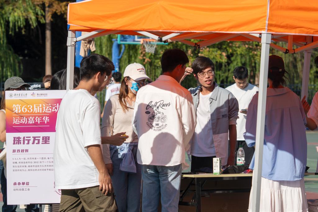 校运会运动嘉年华于10月18至19日在东运动场篮球场举行,旨在为紧张参赛的运动员及观赛的师生提供一个放松心情、舒缓压力的乐园。其中,动科动医学院举办的“珠行万里”项目,以其新颖的规则、有趣的游戏体验深受广大师生的喜爱。