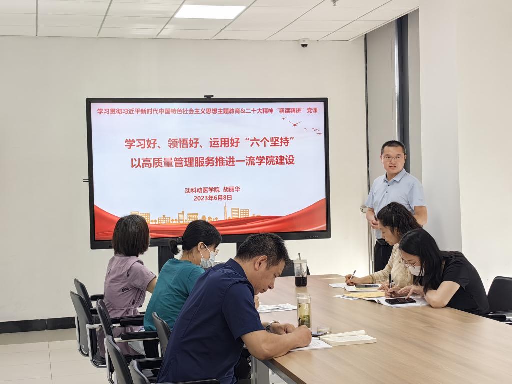 副院长胡丽华同志做《学习好、领悟好、运用好“六个坚持”以高质量管理服务推进一流学院建设》的主题党课。他通过“六个坚持”是马克思主义中国化时代化的必然表达,“六个坚持”为新时代取得伟大成就提供了科学思想指引和坚持以“六个坚持”武装头脑、指导实践、推动工作三个方面阐述,提出要在学习贯彻习近平新时代中国特色社会主义思想中深刻领会“六个坚持”,切实用以武装头脑、指导实践、推动工作,以高质量的管理服务推进一流学院建设。
