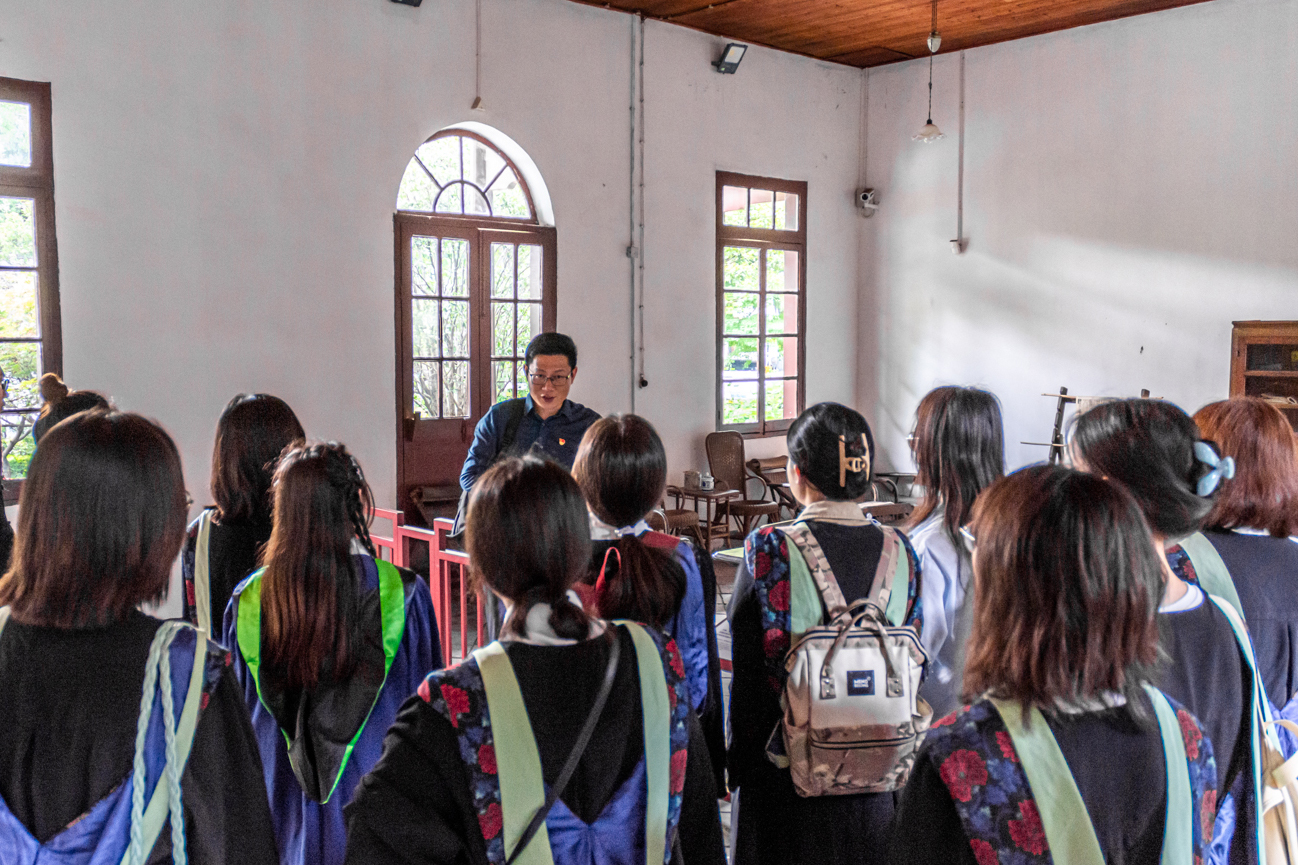 的45名毕业生党员代表身着学位服在马克思主义学院副教授陈明辉的带领下来到武汉农民运动讲习所旧址,静听历史,进行了别开生面的主题教育活动。